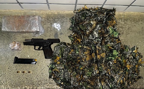 Com o suspeito, os policiais apreenderam uma pistola Taurus G3 calibre 9mm, três munições intactas, uma vestimenta camuflada tipo ghillie, além de drogas: 92 gramas de crack, 10 papelotes de cocaína e 604 gramas de maconha.