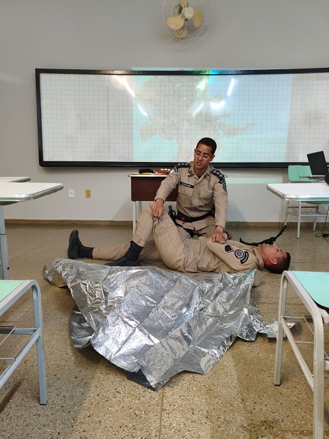 Na etapa prática, os policiais participaram de uma oficina de aplicação de torniquete com material de treinamento, permitindo que o efetivo praticasse a técnica, esclarecesse dúvidas e reforçasse a confiança no uso do equipamento em situações reais.