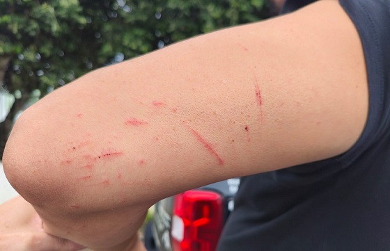 * As lesões no braço esquerdo de Ary, que, segundo ele, ainda sente dores dos golpes que recebeu.