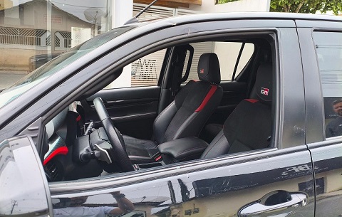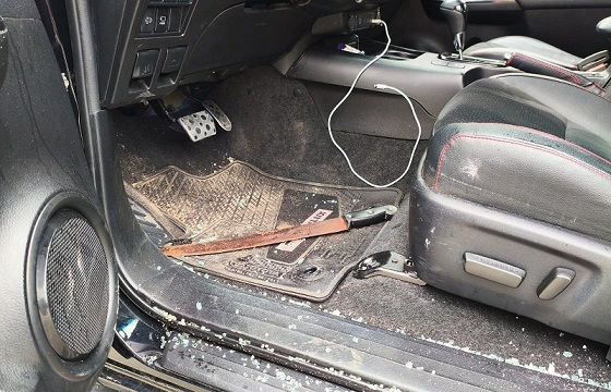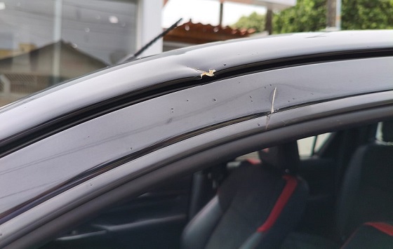 * As marcas do ataque no veículo, incluindo o vidro quebrado.